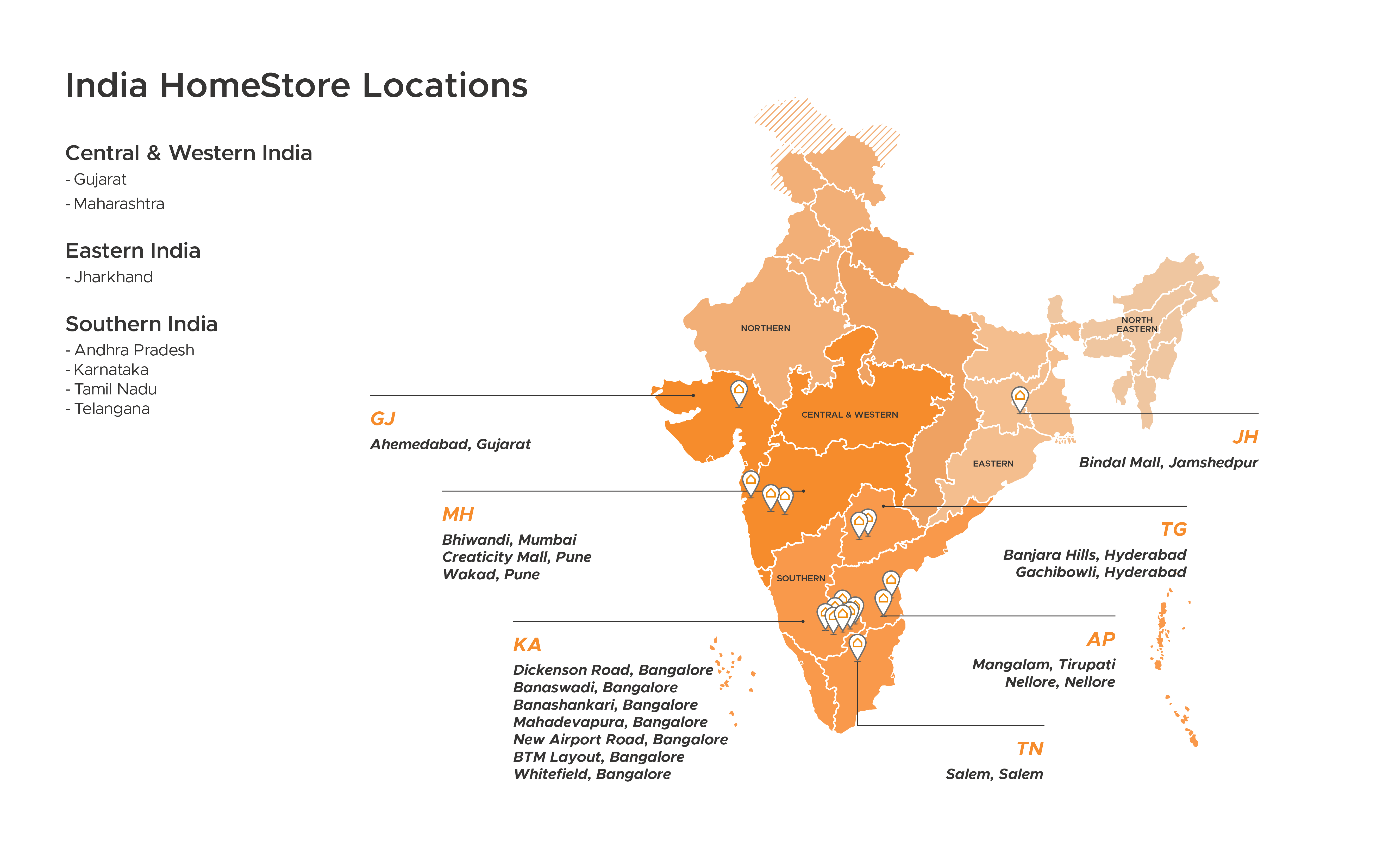 Ashley Furniture offers stylish home furniture and home décor in India, with multiple locations across the country. Ashley Furniture HomeStores are located in Central and Western India (Ahmedabad, Gujarat; Mumbai, Maharashtra; and two locations in Pune, Maharashtra), Eastern India (Jamshedpur, Jharkhand), and Southern India (Nellore, Andhra Pradesh; Tirupati, Andhra Pradesh; and seven locations in Bangalore, Karnataka, including Airport Road, Banashankari, Bengaluru, BTM Layout, Mahadevapura, and Whitefield).